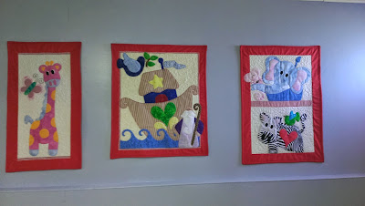 This is made from the same designer as the Mother Goose Quilt I made earlier. This theme was "Noah's Friends." Every block was appliqued using the blanket stitch on my sewing machine. Don't all the animals look so happy! While I was making this I sewed the same block 2 times. One quilt was for the shop and another a shower gift. I thought these really turned out cute. These quilts are so much fun to do.